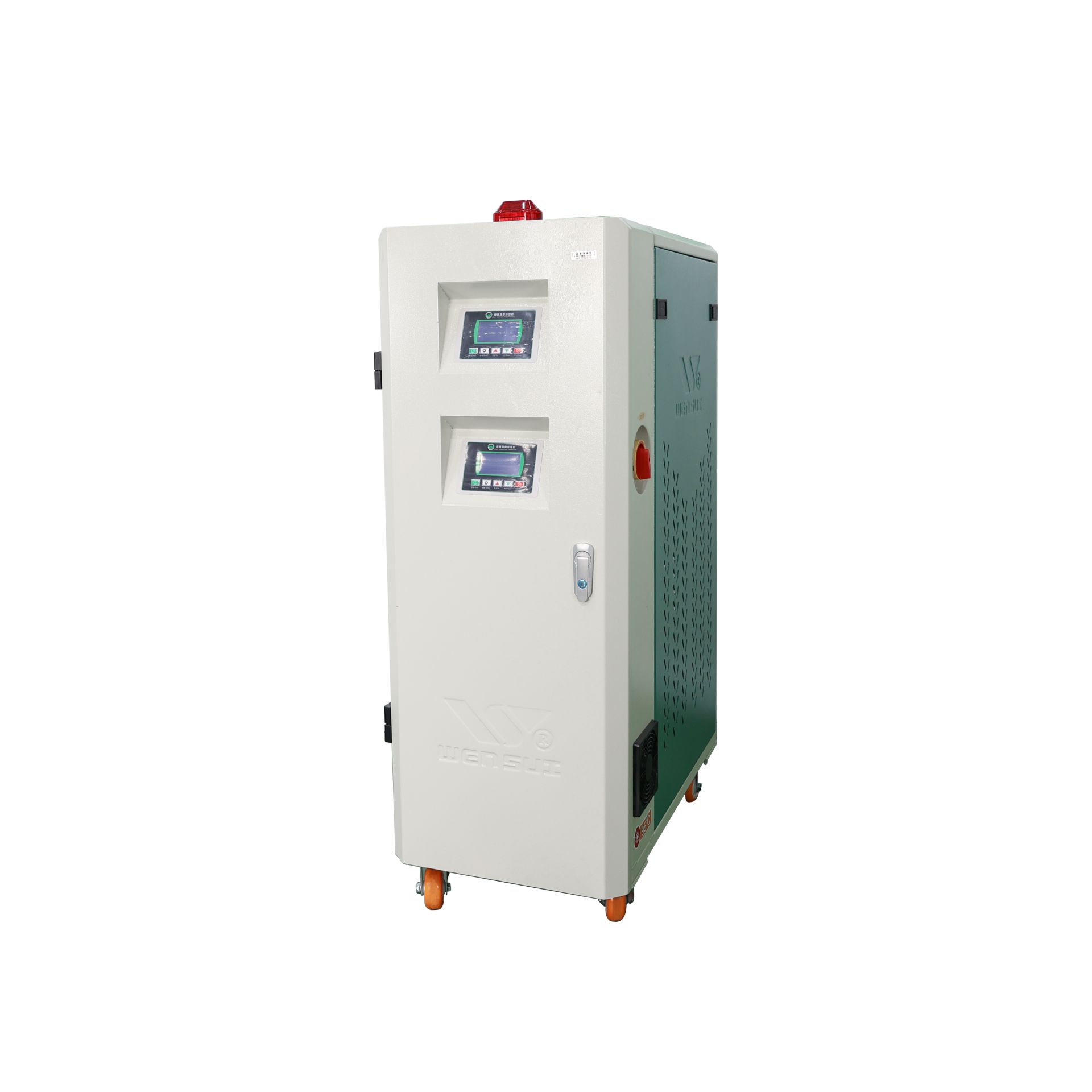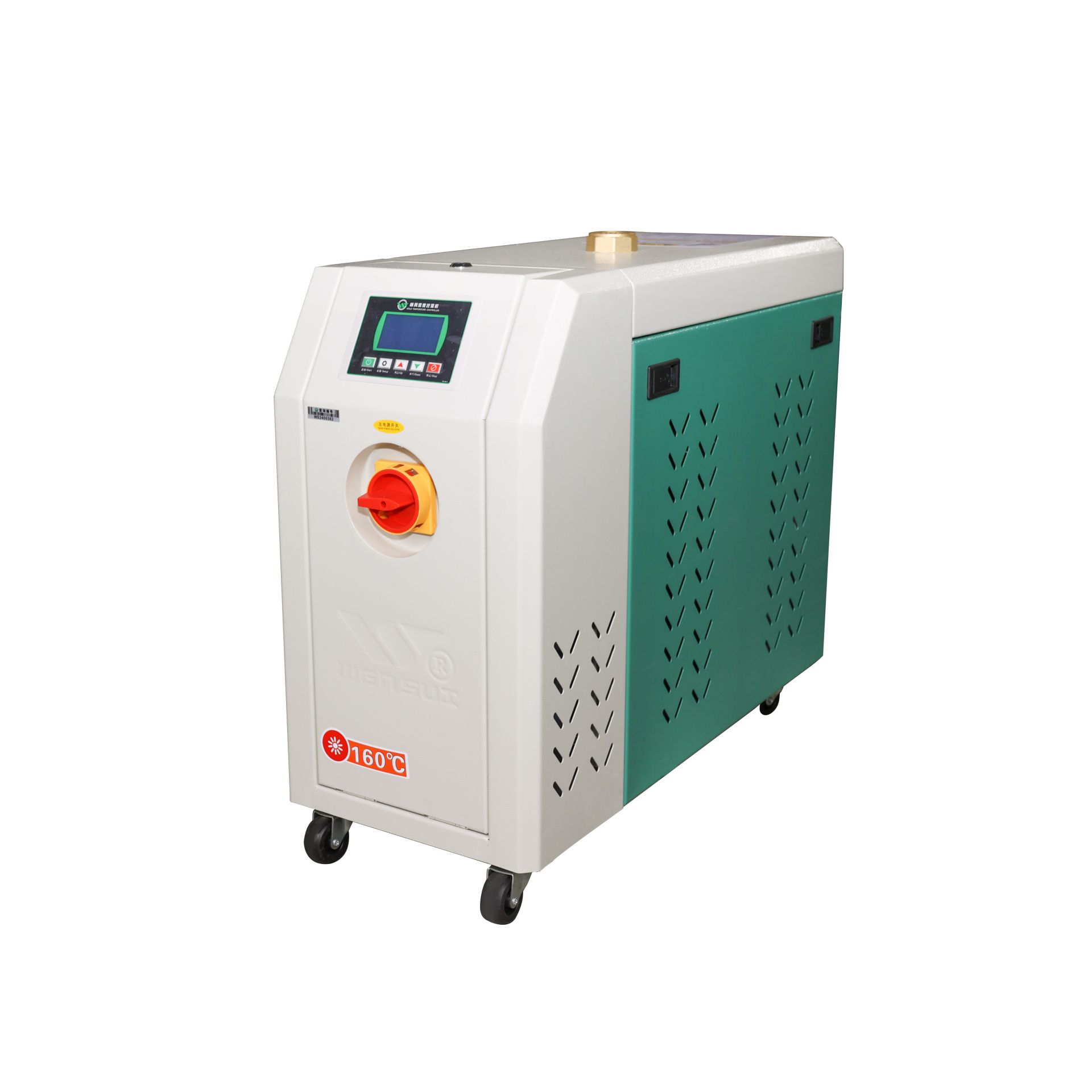 性能特点采用微电脑控制、液晶显示、按钮操作。采用 P.I.D.参数自整定双向(加热/冷却)控制,分段式控温系统,在任何状态下均可保持稳定的模具温度,控温精度高达±0.5°C。可进行中、英文切换,操作界面简洁易懂,故障问题文字显示一目了然。电器与加热装置分离式设计,有效避免了高温对电器造成的损坏。采用优质、高效泵浦,能适应各种模具的控温要求。内部采用不锈钢制造,耐腐蚀、高压防爆、恒温时间长,热效率高。六大保护功能:热电偶断偶报警、电源缺相保护、逆相保护、过载保护、过热保护及缺水保护。